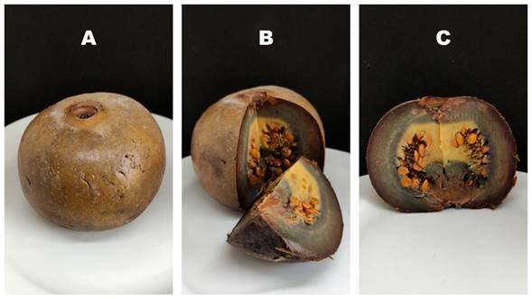 Figura 2: Borojó. A: Fruto entero. B. Corte en cuarto, C: Cortado por la mitad. Fuente: González-Jaramillo et al. (2023), licencia CC BY 4.0.