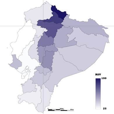 La provincia con el RSV máximo (100) es Imbabura. Le siguen Carchi, Pichincha y Cotopaxi, todas provincias del norte de la sierra. Por el otro lado, la provincia con RSV mínimo es Manabí (28) seguida por Guayas, Loja y El Oro. La Tabla 1 detalla el RSV por provincia.