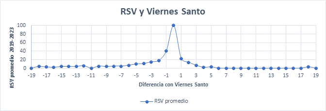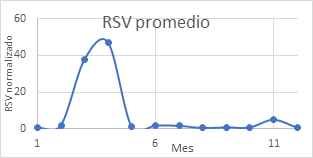 Al normalizar los valores de RSV para que cada año el mes de interés máximo tenga un RSV renormalizado de 100 y promediar el RSV mensual vemos un pico en los meses de marzo y abril, y un pico minoritario en noviembre (Figura 4). El pico de marzo y abril corresponde a Semana Santa, que es una fiesta que depende de un calendario lunar, alineado con la Pascua judía, el 14 del mes de Nisán (Valerio, 2023). El pico minoritario que se observa en noviembre es un artefacto de la renormalización por dos picos menores en noviembre de 2015 y 2023.